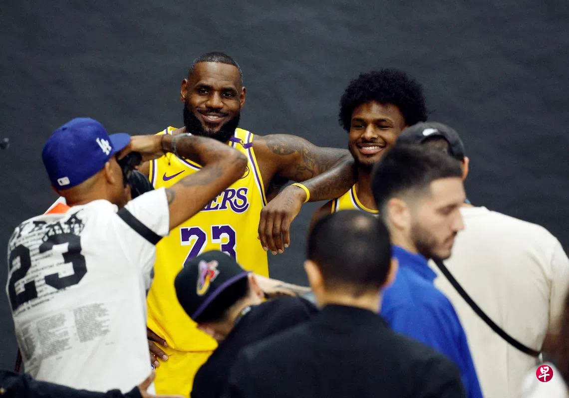 (洛杉矶综合电)在成为历史上第一对在美国职业篮球联盟(NBA)一起打球的父子档之前,勒布朗·詹姆斯(LeBron James)和布朗尼·詹姆斯(Bronny James)率先在星期一(9月30日)的洛杉矶湖人(LA Lakers)媒体日上,在镜头前进行了近距离接触。