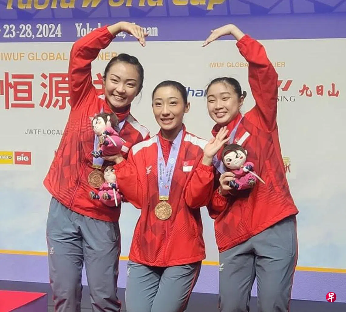 新加坡武术队星期天(10月27日)在日本横滨举行的第三届套路世界杯表现不俗,林思韦、罗芝宁和陈子怡都在个人项目站上领奖台,王瓅苓也与罗芝宁、陈子怡一起在团队项目获得奖牌。