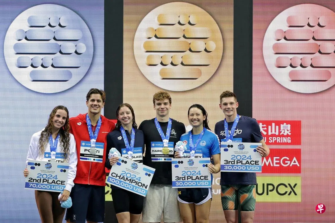 法国泳将马尔尚(Marchand)和美国好手凯特·道格拉斯(Kate Douglass)星期六(11月2日)在游泳世界杯当选全场男女选手总冠军,抱得10万美元(约13万2600新元)总奖金。