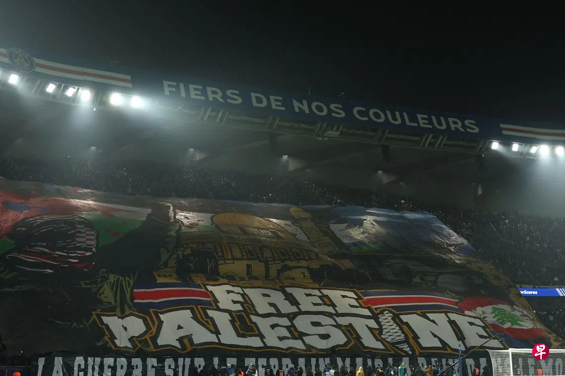 PSG在主场被西班牙甲级联赛球队体育马德里(Atletico Madrid)2比1击败。比赛期间,球迷们展示了覆盖整个看台的巨型横幅,上面写着“解放巴勒斯坦”的标语。