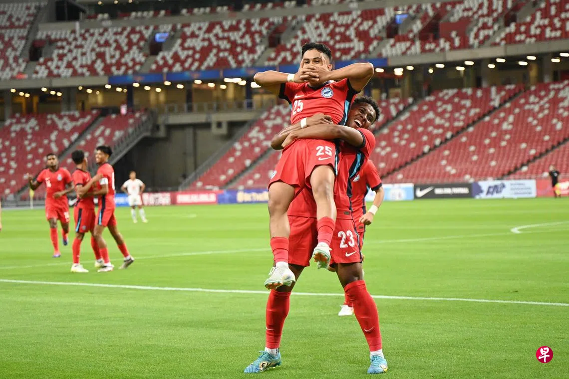 “雄狮”新加坡国家足球队星期四(11月14日)晚上在国家体育场的国际足球友谊赛捏了一把冷汗,在比赛尾声两分钟进两球,3比2逆转缅甸,取得主帅小仓勉今年2月上任后的首场胜利。