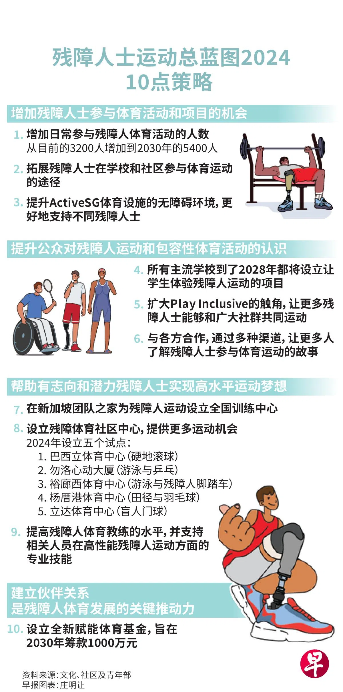 文化、社区及青年部推出2024年更新版残障人士运动总蓝图,提出10项策略,以提高我国的残障人士运动人数,加强国人对残障体育的意识,并将推出一项新的体育基金,为残障人士提供更多参与体育活动的机会,与大众建立更深的联系,让我国成为更加包容的社会。