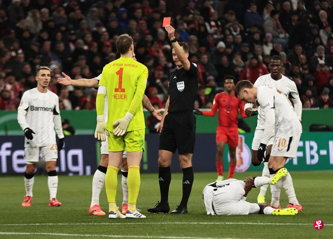 (慕尼黑法新电)拜仁慕尼黑(Bayern Munich)在新加坡时间星期三(12月4日)凌晨进行的德国杯16强赛中遭卫冕冠军莱沃库森(Leverkusen)淘汰,门将诺伊尔(Neuer)在其职业生涯的第866场比赛中首次被红卡罚下。