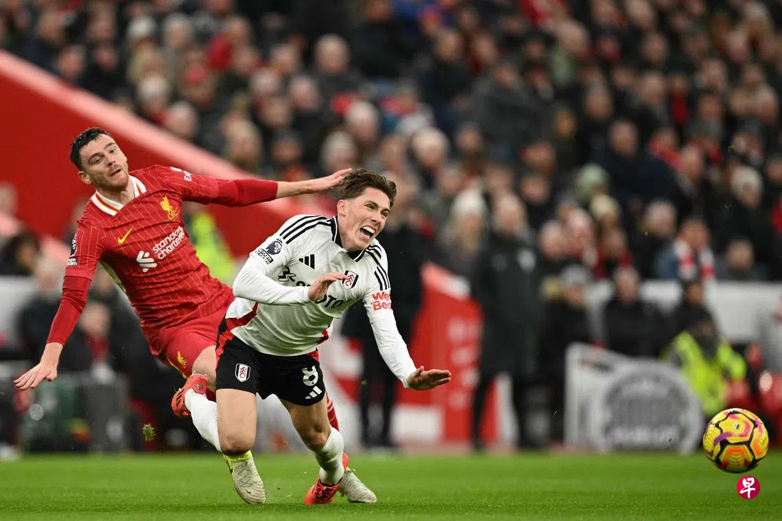 利物浦在赛中两度落后,但两次都顽强地扳平比分。富勒姆先是在第11分钟由佩雷拉(Pereira)凌空抽射首开纪录。随后利物浦后防线遭遇减员,后卫罗伯逊(Robertson)因放倒威尔逊(Wilson),遭红卡罚下。