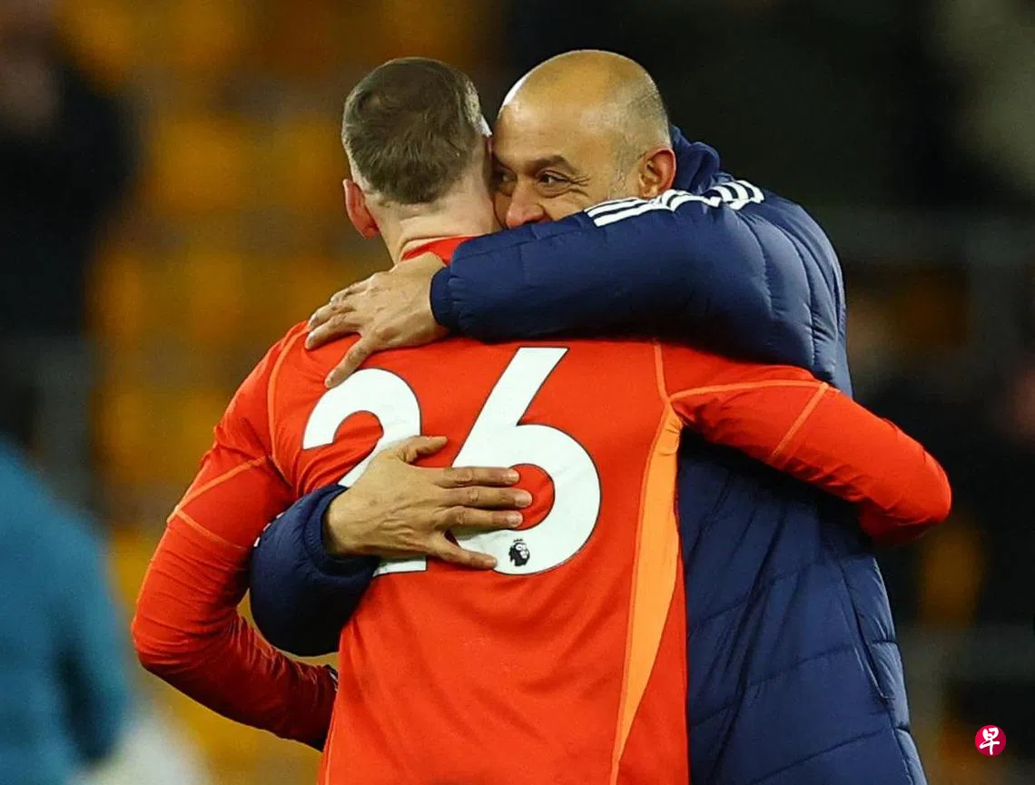 (伍尔弗汉普顿综合电)诺丁汉森林(Nottingham)延续强劲势头,在新加坡时间星期二(1月7日)凌晨的英格兰超级联赛上,客场3比0轻取狼队(Wolves),在拿下六连胜的同时,也追平积分榜次席“炮兵”阿申纳(Arsenal)的积分,暂居第三的位置。