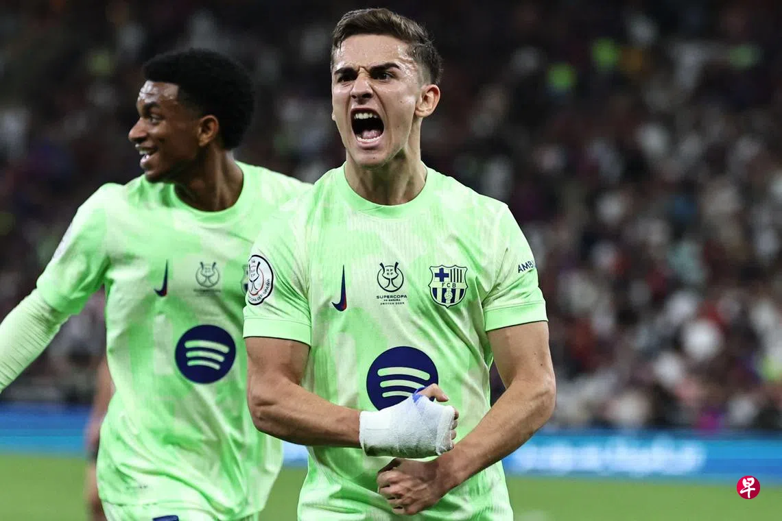 (吉达综合电)尽管面对无法注册进攻组织者奥尔默(Olmo)和新星维克托(Victor)的窘境,巴塞罗那(Barcelona)还是在新加坡时间星期四(1月9日)凌晨于沙特阿拉伯举行的西班牙超级杯半决赛中以2比0击败毕尔巴鄂(Atletico Bilbao),锁定决赛资格。