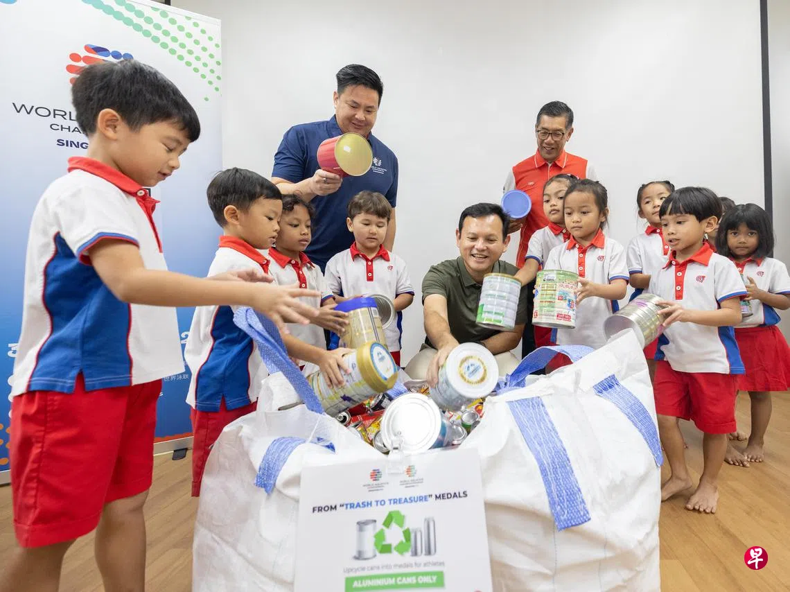这是世界水上运动锦标赛首次使用废弃铝料回收制成的奖牌。来自五所PCF Sparkletots幼儿园、八所小学和三所中学的学生参与了此次回收活动。