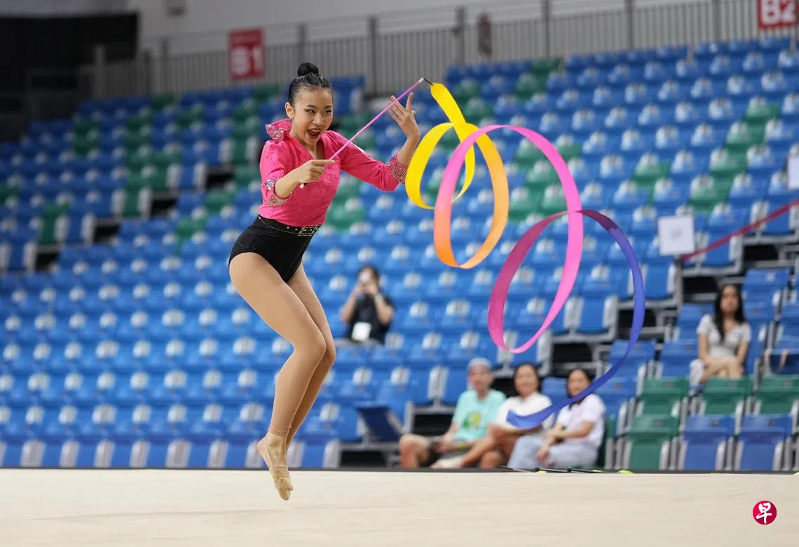 2025年亚洲艺术体操锦标赛星期六(5月17日)在华侨银行室内体育馆继续进行,我国选手杨慧婷(17岁)继前一天闯入成人组的个人圈操和球操决赛后,再获得带操决赛权,意味着她星期天(18日)将在三个决赛中亮相。
