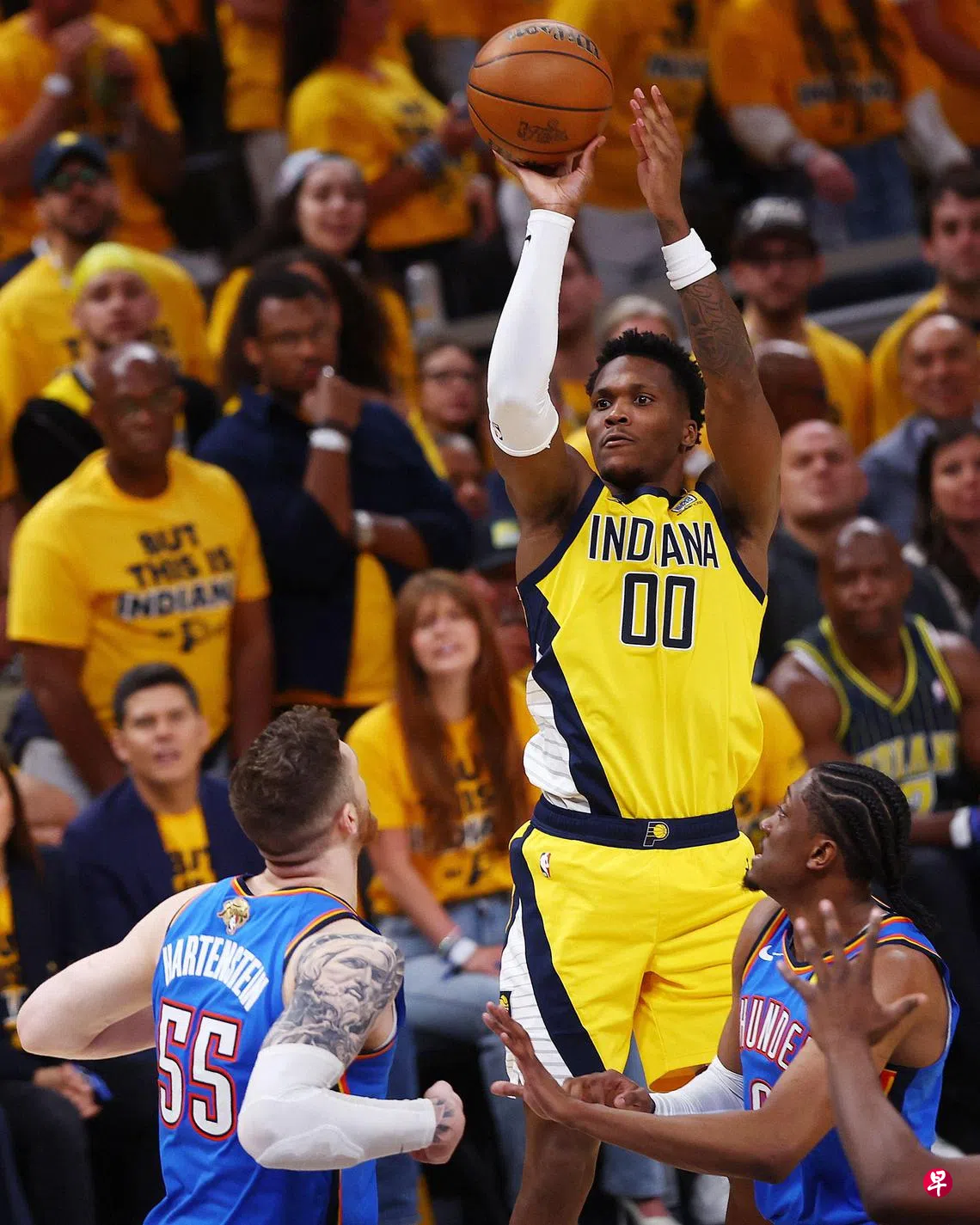 (洛杉矶法新电)在球星哈利伯顿(Haliburton)的带领下,印第安纳溜马(Indiana Pacers)本地时间星期四(6月12日)在美国职业篮球联赛(NBA)总决赛以116比107击败俄克拉荷马城雷霆(Oklahoma City Thunder),将大比分反超至2比1。
