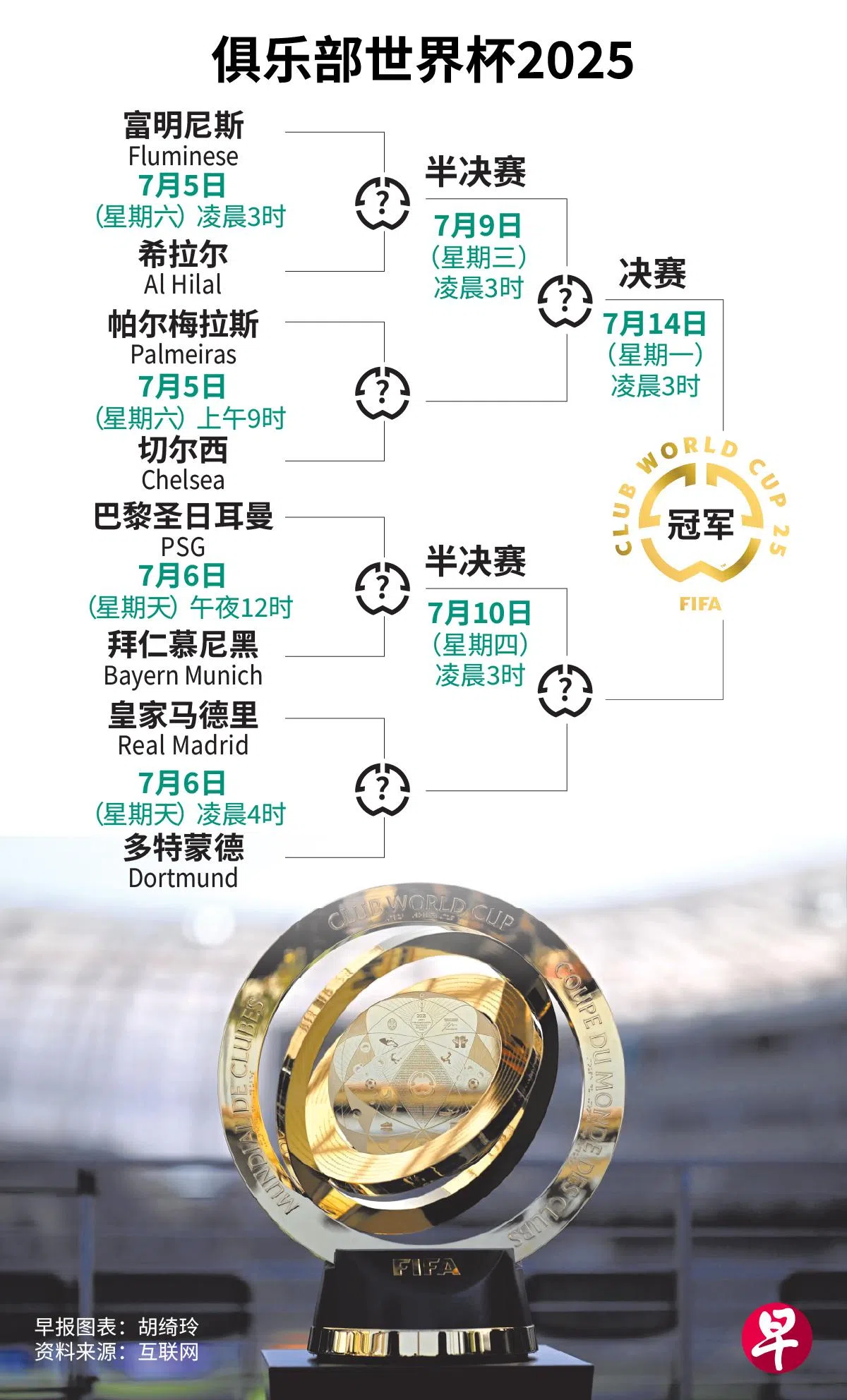 自此,八强球队已全部出炉。在上半区,富明尼斯将迎战希拉尔,而巴西球队帕尔梅拉斯(Palmeiras)将对上切尔西(Chelsea);下半区则是“欧冠级争霸”,由新科欧冠冠军巴黎圣日耳曼(PSG)对德甲霸主拜仁慕尼黑(Bayern Munich),“银河战舰”皇家马德里(Real Madrid)对多特蒙德(Dortmund)。