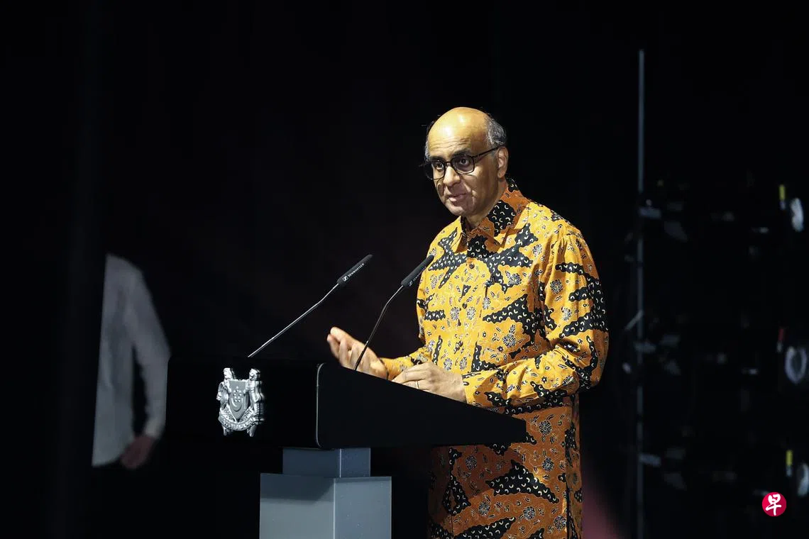 新加坡总统尚达曼于星期四(7月10日)晚上,在新电信水滨剧院(Singtel Waterfront Theatre)主持2025年新加坡世界水上运动锦标赛开幕仪式,热烈欢迎来自世界各地的选手和工作人员齐聚一堂,共襄盛举。