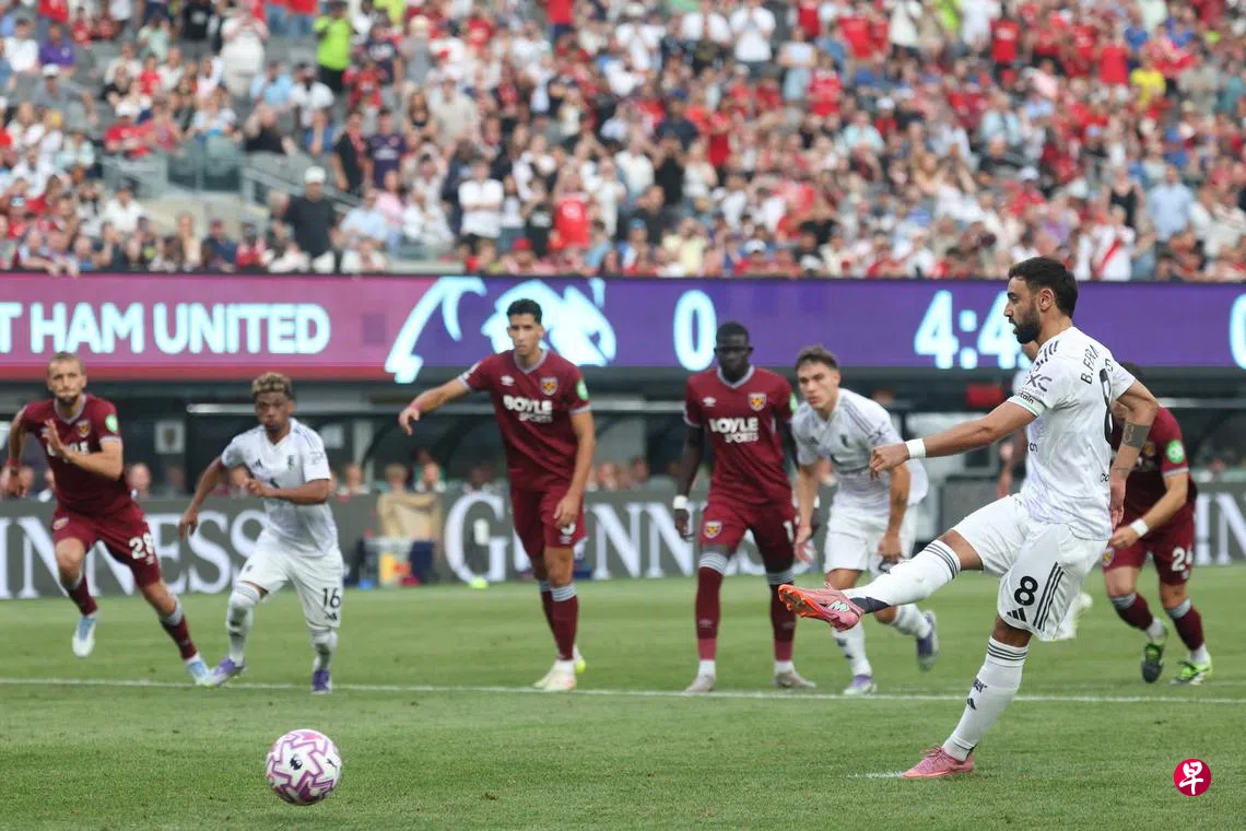 (纽约法新电)凭借布鲁诺·费尔南德斯(Bruno Fernandes)的梅开二度,“红魔”曼联在新加坡时间星期天(7月27日)早上于美国新泽西举行的英超夏季系列赛上,以2比1力挫“铁锤帮”西哈姆(West Ham)。