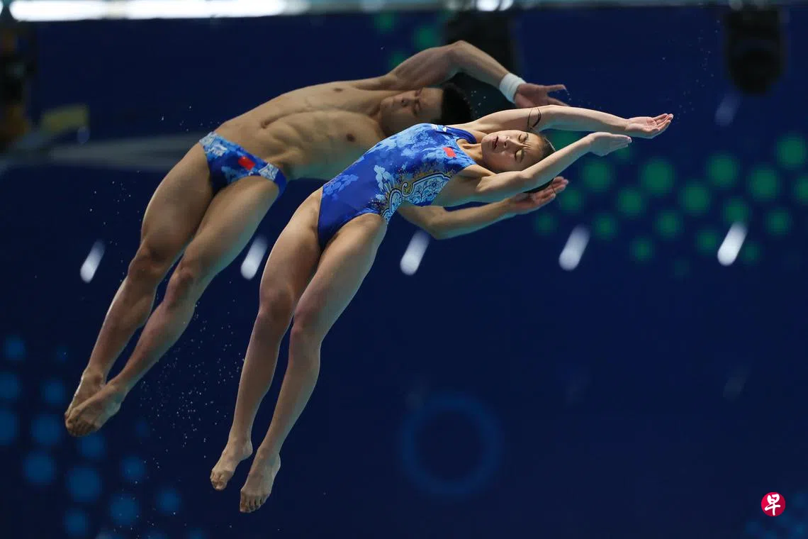 在星期天(7月27日)下午于华侨银行游泳中心(OCBC Aquatics Centre)进行的世锦赛混合双人10米台跳水决赛中,中国组合谢佩玲/朱勇鑫在首跳得分垫底的不利局面下,以323.04的总分强势逆转夺冠,与在男子一米跳板登顶的中国选手郑九源一起,包揽单日跳水双金。
