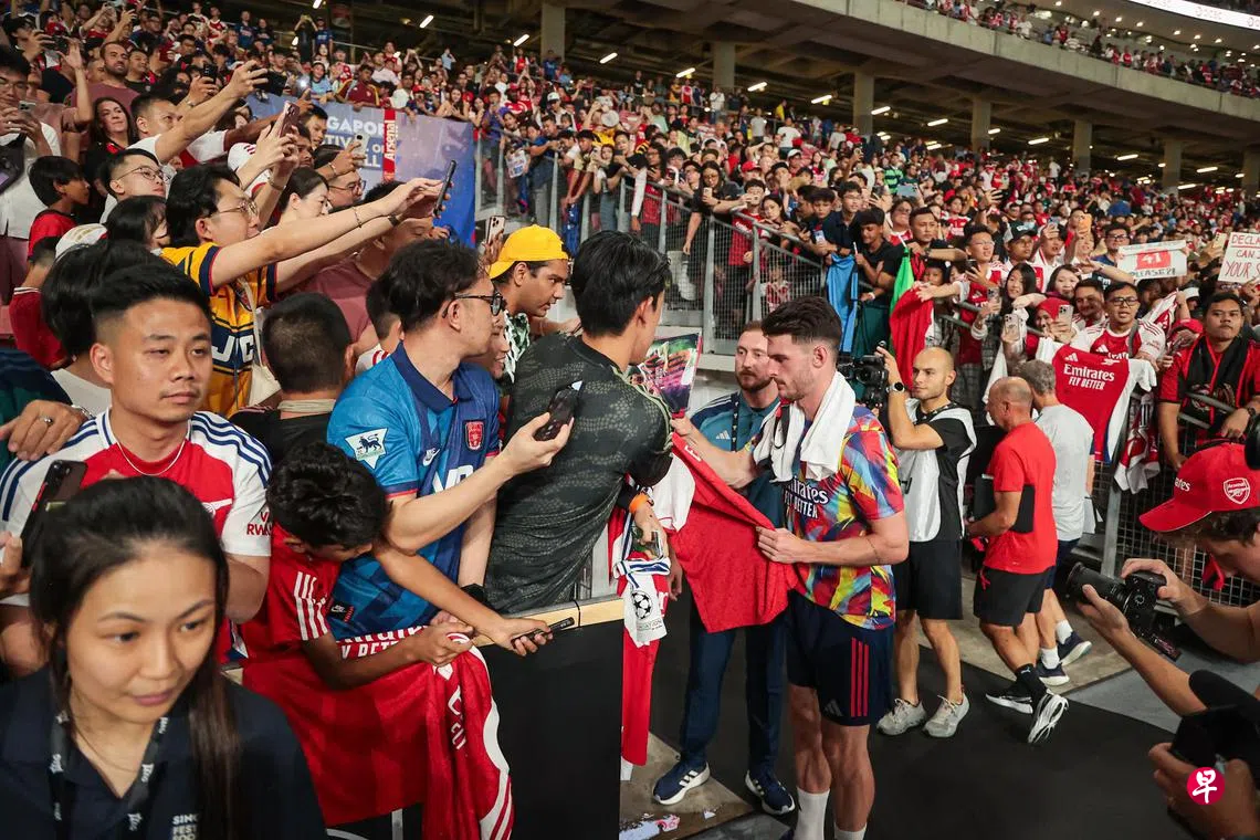 阿申纳球员赖斯在对体育米兰的比赛结束后,为球迷在球衣上签名。 (李冠卫摄)