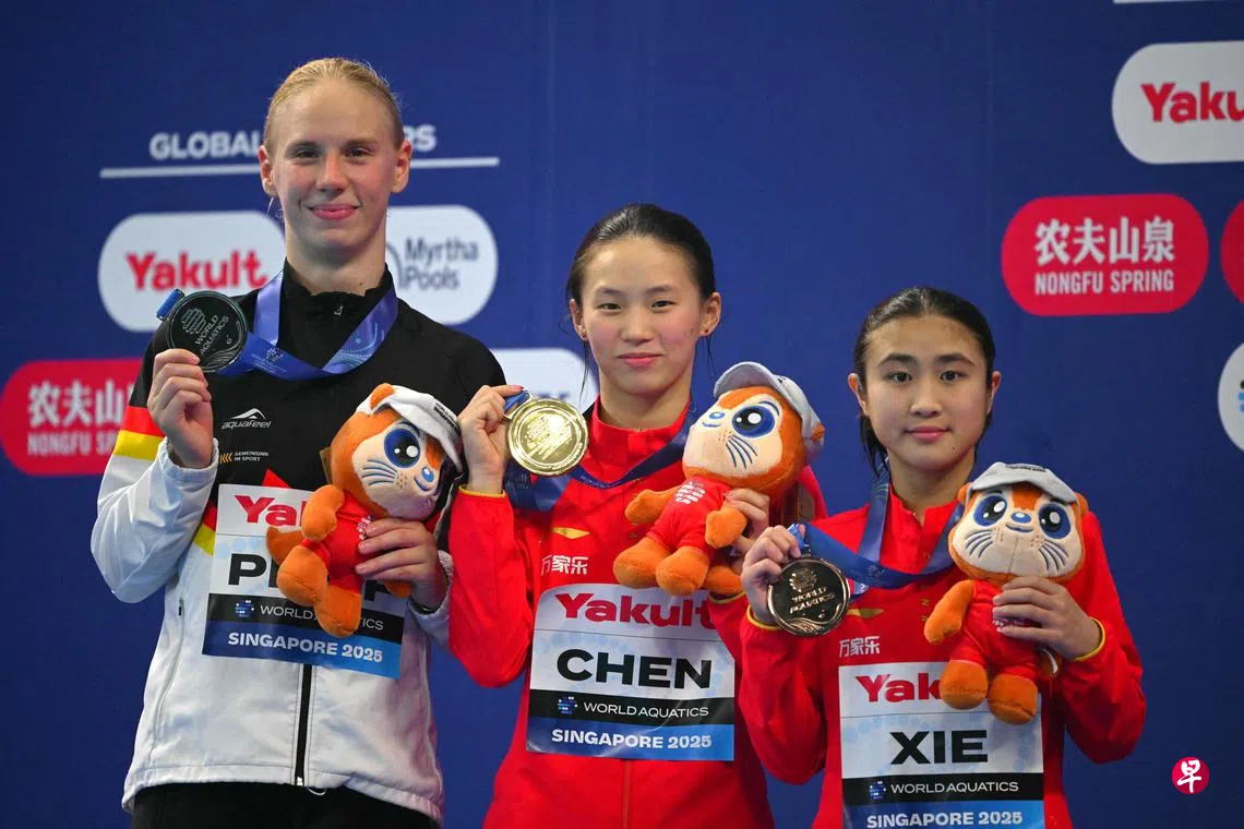 在去年世锦赛和巴黎奥运会这个项目登顶的全红婵缺席本届赛事的情况下,她同样来自广东的15岁师妹谢佩玲最终以358.2分夺铜。