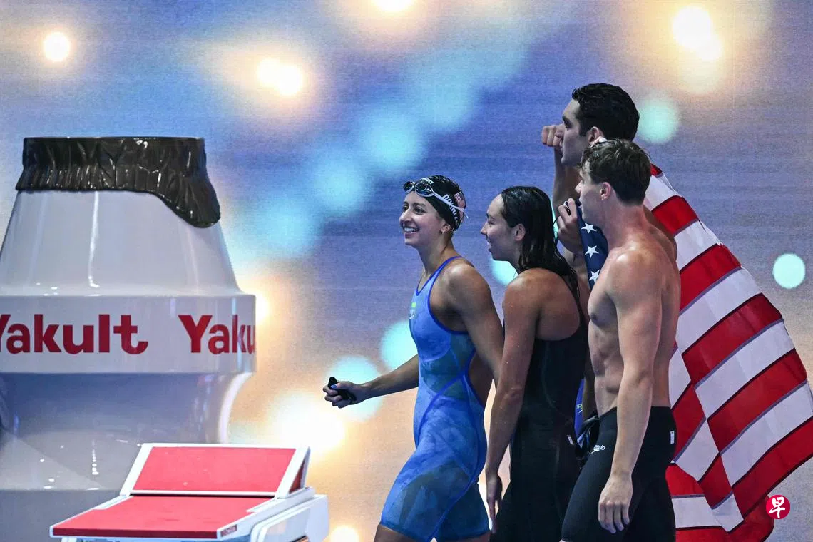 新加坡水上运动世锦赛倒数第二天,美国在星期六(8月2日)拿下六枚游泳金牌中的三枚,并在男女4X100米自由泳接力赛中由凯特·道格拉斯(Kate Douglass)、托丽·赫斯克(Torri Huske)、亚历克西(Alexy)和萨蒙(Sammon)组成的团队打破世界与大会纪录,成当晚最大赢家。