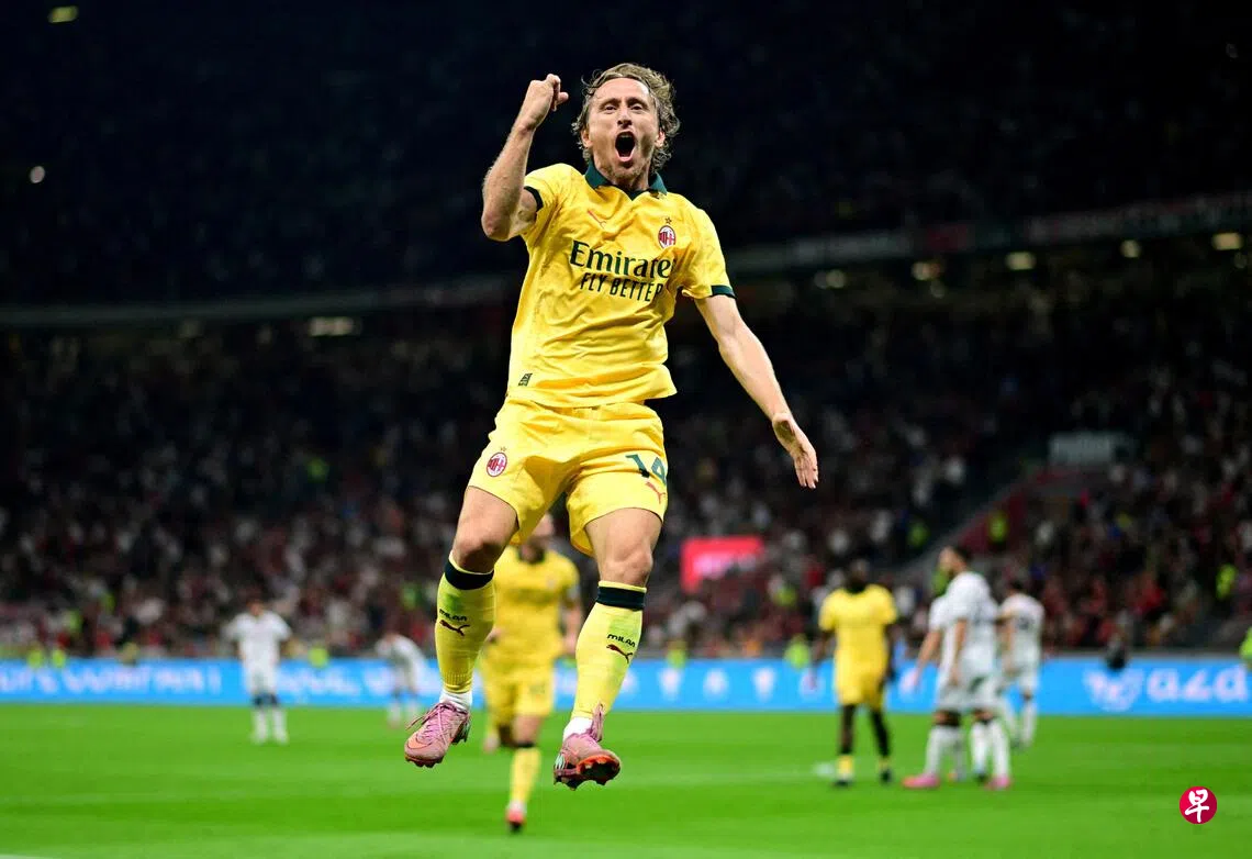 40岁的莫德里奇在第61分钟完美地接应萨莱马克尔斯(Saelemaekers)的传中,以冷静的一脚触球收获他在体米的第一个进球。