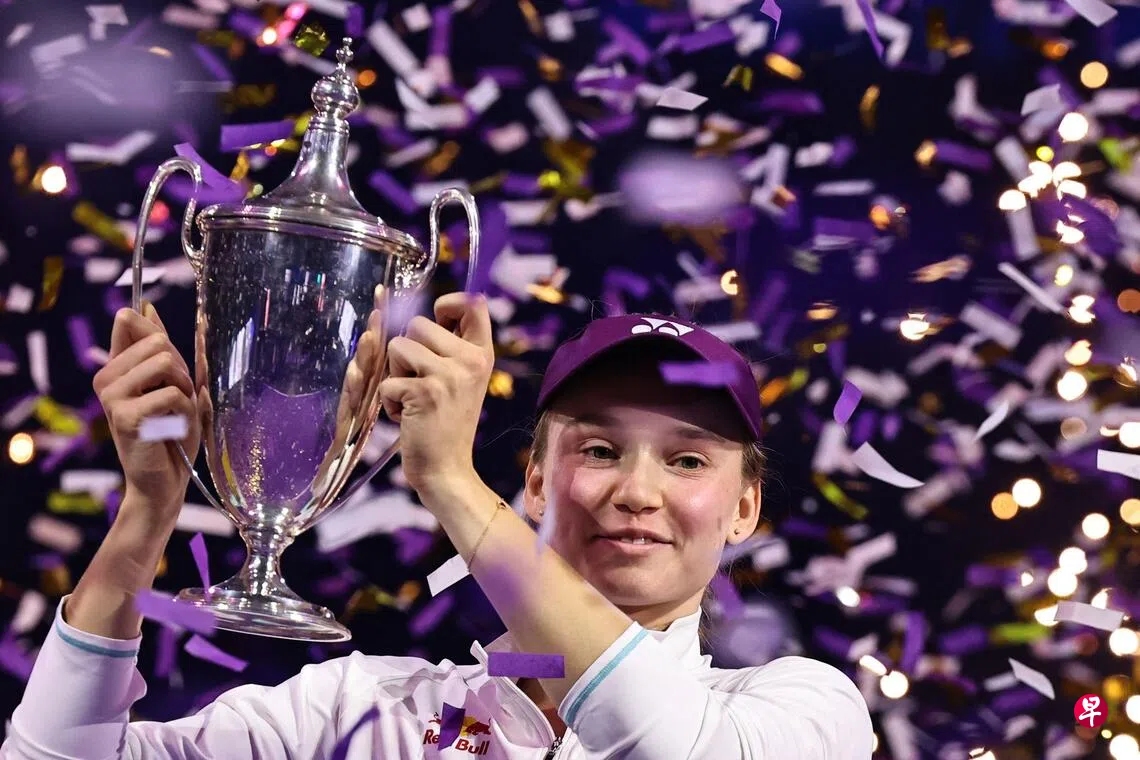 (利雅得综合电)哈萨克斯坦好手伊莲娜·莱巴金娜(Elena Rybakina)在星期六(11月8日)落幕的女子网球选手协会(WTA)年终总决赛女单决赛,以6比3、7比6(0)勇挫世界第一的白罗斯选手阿丽娜·萨巴伦卡(Aryna Sabalenka),成为首名赢得WTA年终总决赛单打冠军的亚洲选手。