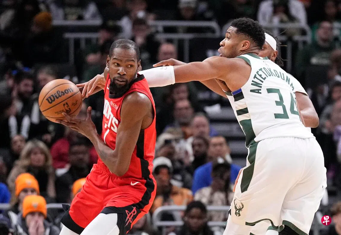 (密尔沃基路透电)超级得分手杜兰特(Durant)在和“字母哥”安特托孔波(Antetokounmpo)的美国职业篮球赛(NBA)对决中更胜一筹,率领休斯敦火箭(Houston Rockets)在新加坡时间星期一(11月10日)客场以122比115逆转击败密尔沃基公鹿(Milwaukee Bucks)。