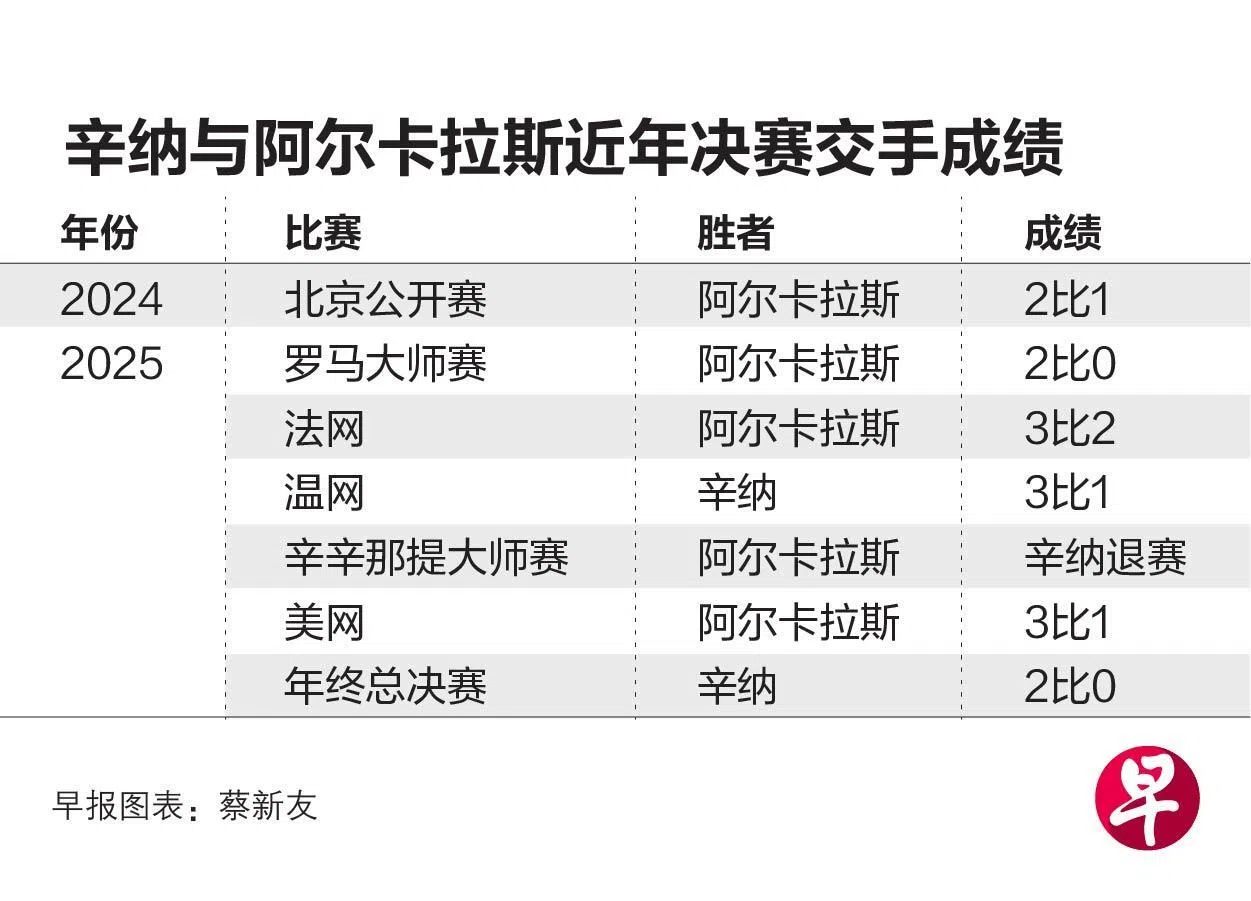 在本赛季的四大满贯中,两人各赢下两场,六次大满贯得主阿尔卡拉斯拿下法国公开赛和美国公开赛锦标,四次大满贯得主辛纳则在澳洲公开赛和温布登锦标赛封王。