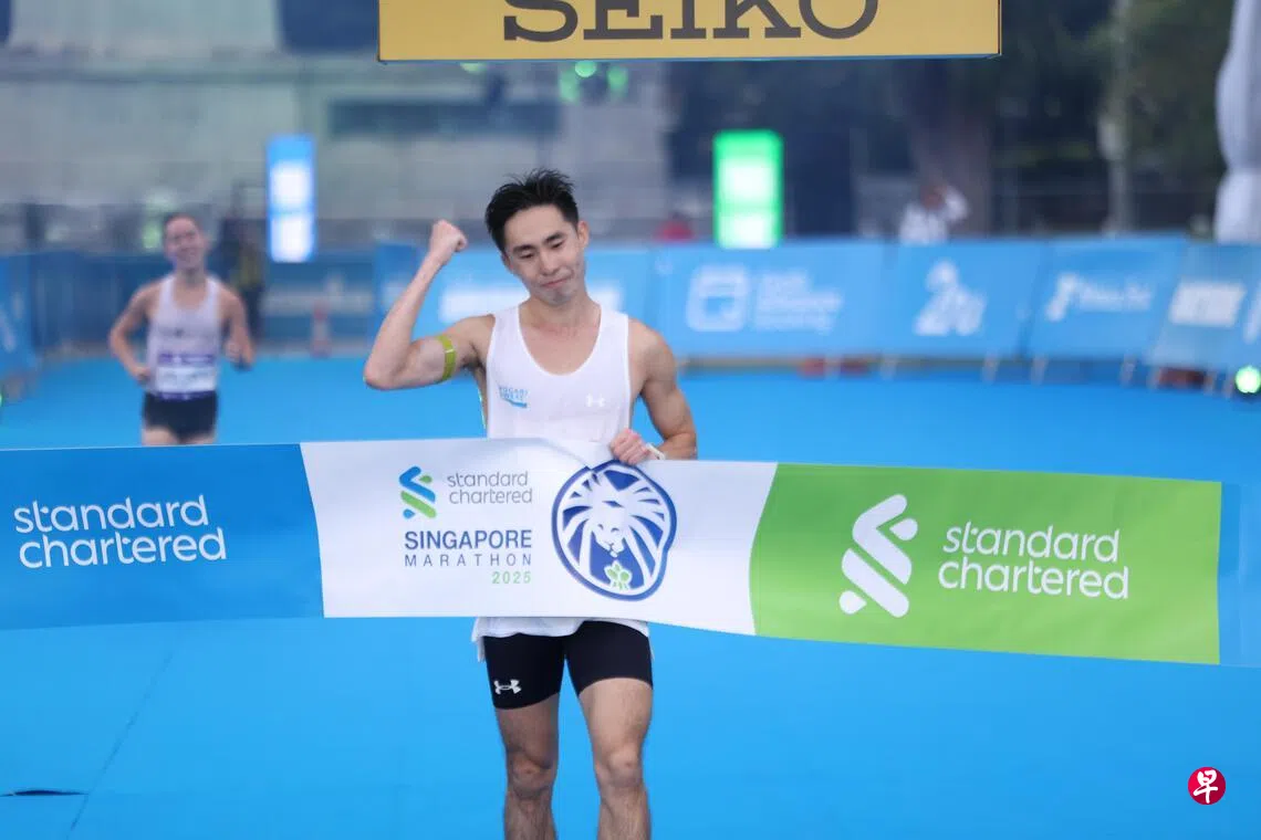 继星期六(12月6日)在渣打新加坡半程马拉松赛夺得全国冠军后,我国长跑好手苏睿勇在星期天(7日)的全程马拉松再度率先冲线,与女子组的施文丽一起,成功卫冕全国冠军。