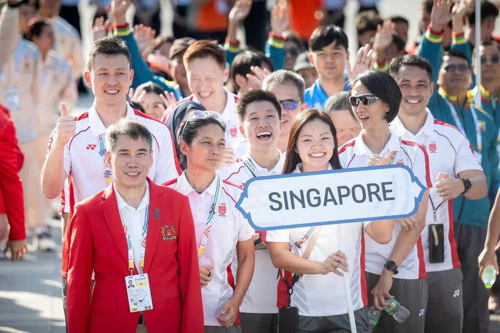 新加坡代表团进场后,健儿们挥着国旗交谈、合影。(白艳琳摄)