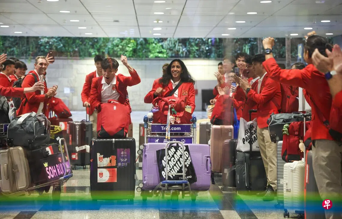 星期三(12月17日)下午,新加坡航空SQ707航班平稳降落。繁忙的樟宜机场T3航站楼,随即出现了引人注目的景象。一群身穿绣有新加坡国徽红色制服的人,在机场玻璃门后列成两队,用热烈的欢呼声迎接泰国东运会田径金牌得主——珊蒂(Shanti)和郭俊杰。