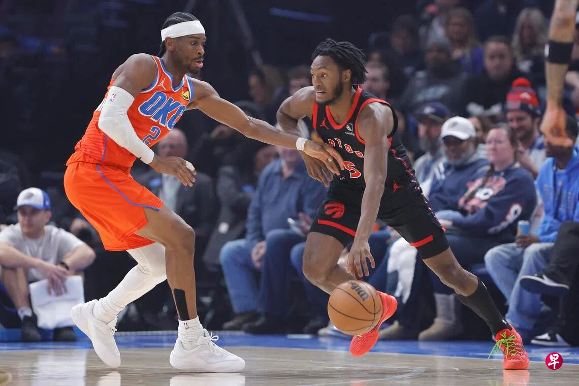 (俄克拉荷马城综合电)奎克利(Quickley)新加坡时间星期一(1月26日)在最后两分钟内命中两记关键三分球,帮助多伦多猛禽(Toronto Raptors)以103比101客场掀翻俄克拉荷马城雷霆(Oklahoma City Thunder),送给美国职业篮球赛(NBA)卫冕冠军赛季第十败。