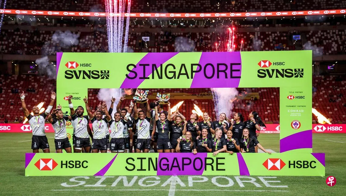 汇丰银行新加坡七人制橄榄球赛星期天(2月1日)晚在国家体育场落下帷幕,斐济男队以21比12逆转法国,实现卫冕;新西兰女队则以36比7再胜去年决赛对手澳大利亚,豪取狮城三连冠。
