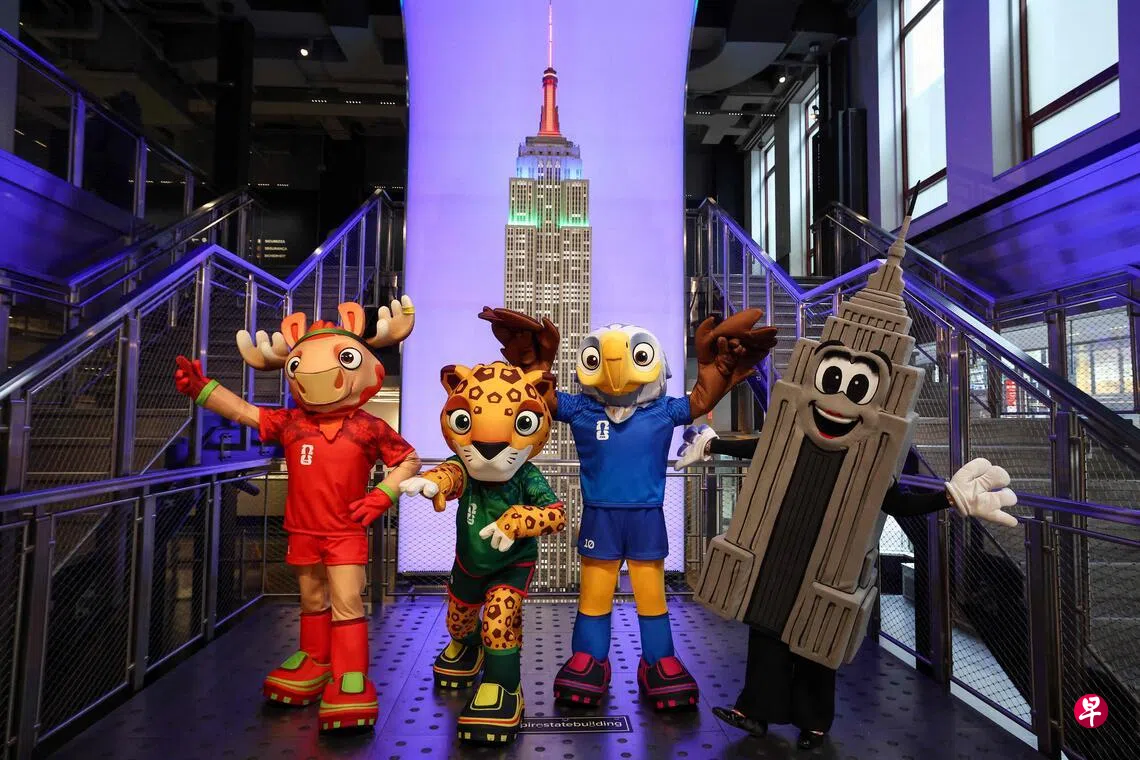 主办方与本届赛事的三个吉祥物,也一同出席在这座高达1454英尺的曼哈顿摩天大楼举行的庆祝仪式。三个吉祥物分别是加拿大的驼鹿“Maple”、墨西哥的美洲虎“Zayu”和美国的白头鹰“Clutch”。