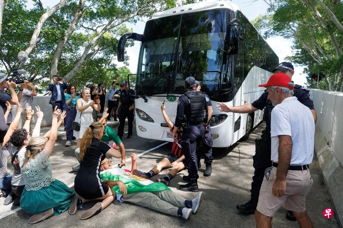 (黄金海岸综合电)在澳大利亚宣布庇护五名伊朗女子足球员后,伊朗国家队其余成员在星期二(3月10日)下午启程到达机场,准备回国。其中一人不情愿地被拉上巴士,一些反对球队离开澳洲的民众肉身拦车,但无法阻止巴士开动。