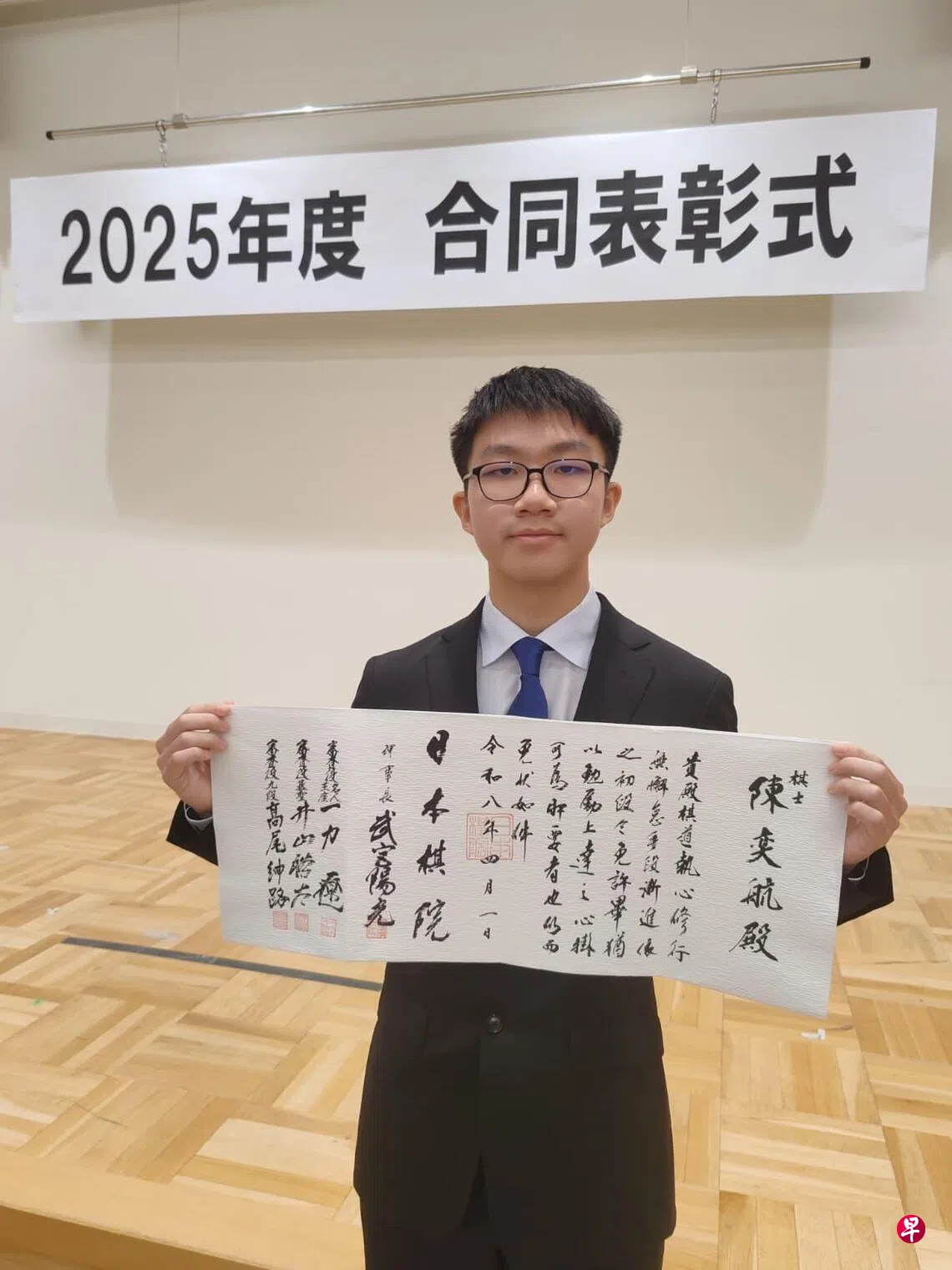在上午于日本棋院东京本院举行的职业入段仪式上,陈奕航和另外六名年龄相仿的选手,成为日本棋院新一批职业棋手。他是七人中加入棋院最晚的院生,在去年11月东京本院的“2026年度冬季棋士采用试验—本战”中夺冠而晋升职业一段。