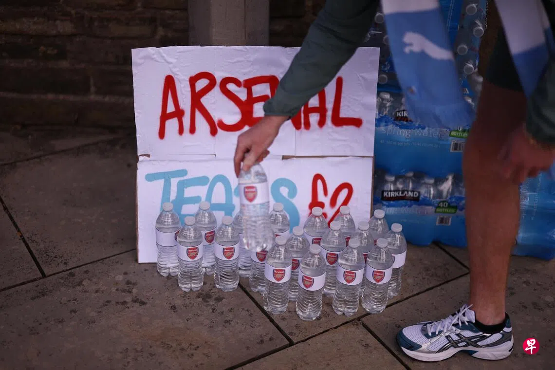 (曼彻斯特综合电)印有“炮兵”阿申纳(Arsenal)队徽的水瓶此前爆红后,在星期天(4月19日)炮兵客战曼市(Manchester City)的比赛前再次出现。有人在曼市主场伊蒂哈德球场外贩卖这些瓶装水,称这些是“阿申纳的眼泪”。