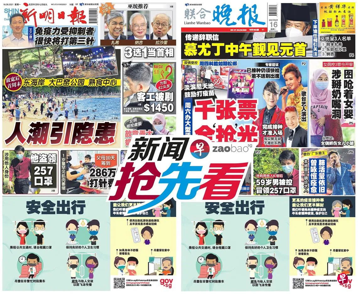 8月16日新闻抢先看:客工以为2元剪发 发廊刷走1450元zaobao.sg直播节目《新闻抢先看》让观众第一时间掌握晚间报章《新明日报》和《联合晚报》当天的重点新闻。 《新闻抢先看》在每周一至五(公定假日除外)下午4时30分直播。 节目由李丽敏、刘永健、李熙爱、卢凌之轮流主持,每期邀请新明和晚报的新闻主任和记者们上节目分享当天要闻,与观众进行交流。 ASUS是本节目的支持伙伴。 新闻抢先看新明日报联合晚报宅在家·看新闻上一篇8月16日《老总 Group Chat》:上厕所也区分有无接种疫苗?下一篇8月17日《老总 Group Chat》:慕尤丁辞职