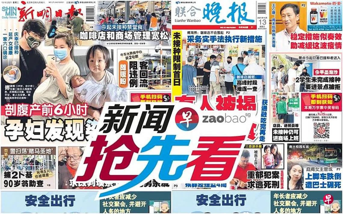 10月13日新闻抢先看:剖腹产前六小时 孕妇发现染疫zaobao.sg直播节目《新闻抢先看》让观众第一时间掌握晚间报章《新明日报》和《联合晚报》当天的重点新闻。 《新闻抢先看》在每周一至五(公定假日除外)下午4时30分直播。节目由李丽敏、刘永健、李熙爱、卢凌之轮流主持,每期邀请新明和晚报的新闻主任和记者们上节目分享当天要闻,与观众进行交流。 ASUS是本节目的支持伙伴。 新闻抢先看新明日报联合晚报宅在家·看新闻上一篇10月13日《老总 Group Chat》:蔡英文“互不隶属”论下一篇10月14日《老总 Group Chat》:柔性宣导防疫措施