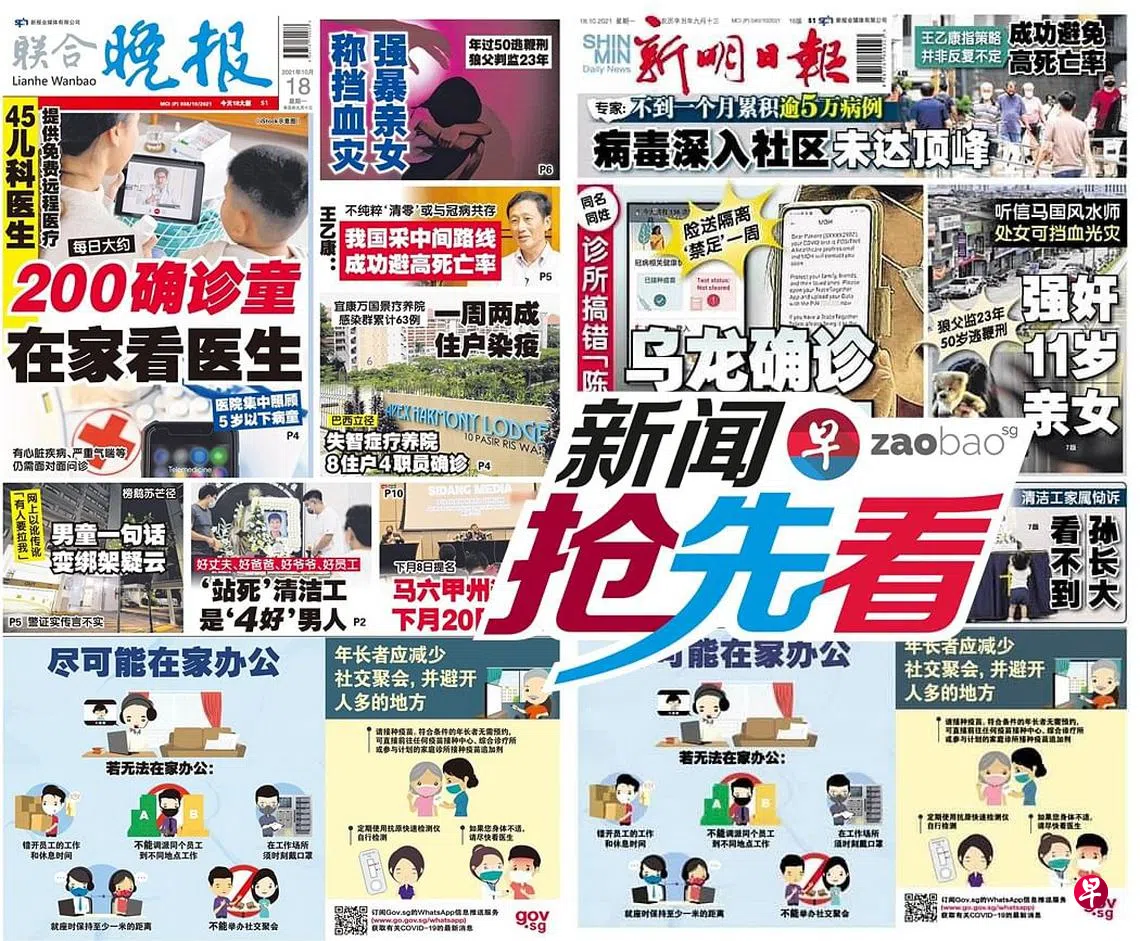 10月18日新闻抢先看:同名同姓诊所搞错 乌龙确诊阿嬷吓哭zaobao.sg直播节目《新闻抢先看》让观众第一时间掌握晚间报章《新明日报》和《联合晚报》当天的重点新闻。 《新闻抢先看》在每周一至五(公定假日除外)下午4时30分直播。节目由李丽敏、刘永健、李熙爱、卢凌之轮流主持,每期邀请新明和晚报的新闻主任和记者们上节目分享当天要闻,与观众进行交流。 ASUS是本节目的支持伙伴。 新闻抢先看联合晚报新明日报宅在家·看新闻上一篇10月18日《老总 Group Chat》:调高消费税前会考虑经济和通胀下一篇10月19日《老总 Group Chat》:西雅惹兰都康宿舍事件