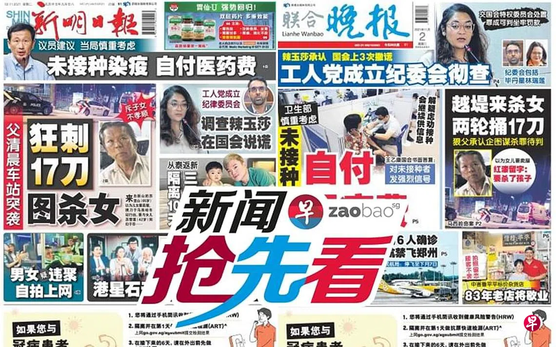11月2日新闻抢先看:当局派员抢修 水管裂冒“喷泉” 罗厘力挡水柱zaobao.sg直播节目《新闻抢先看》让观众第一时间掌握晚间报章《新明日报》和《联合晚报》当天的重点新闻。 《新闻抢先看》在每周一至五(公定假日除外)下午4时30分直播。 节目由李丽敏、刘永健、李熙爱、卢凌之轮流主持,每期邀请新明和晚报的新闻主任和记者们上节目分享当天要闻,与观众进行交流。 ASUS是本节目的支持伙伴。 新闻抢先看宅在家·看新闻新明日报联合晚报上一篇11月2日《老总 Group Chat》:王雷受邀作家节引争议下一篇11月3日《老总 Group Chat》:中国疫情达今年最严峻水平