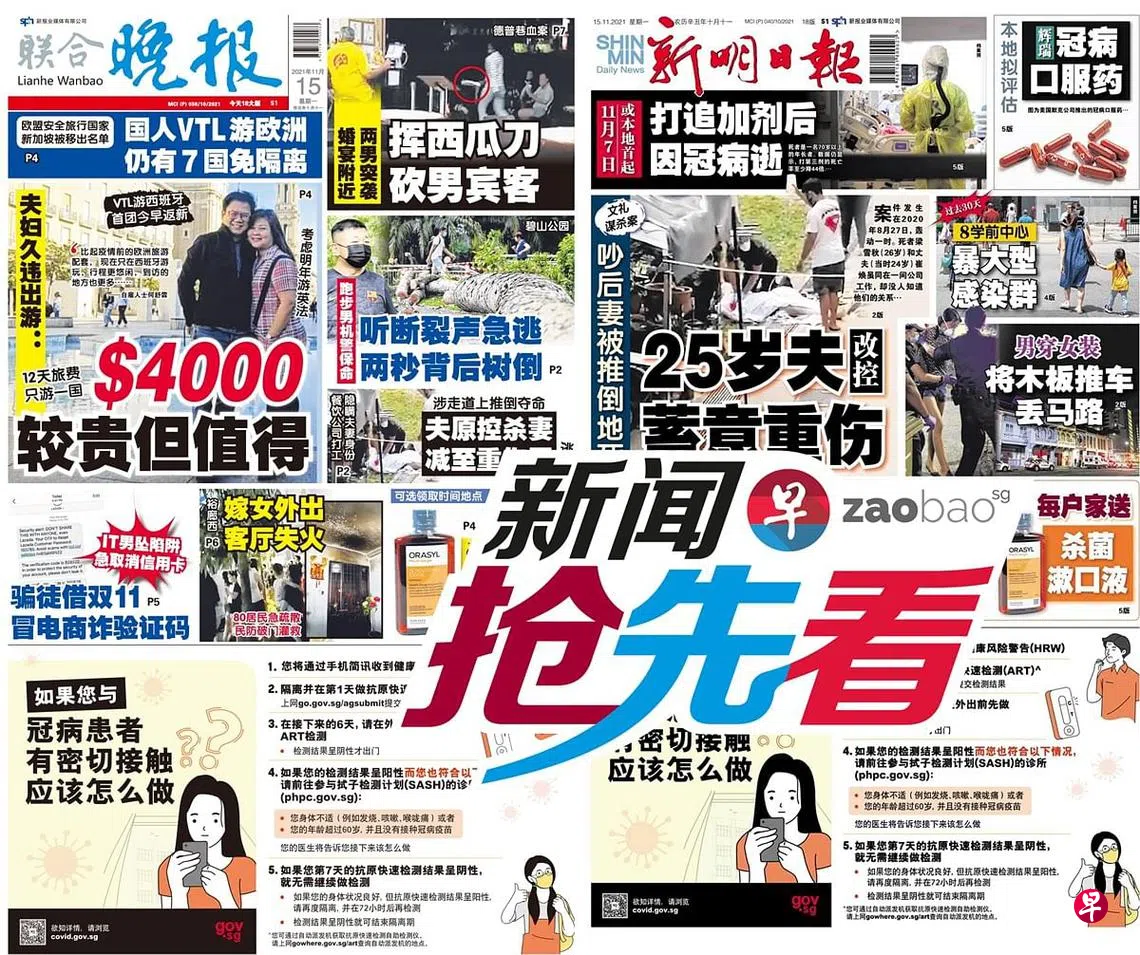 11月15日新闻抢先看:听断裂声急逃 两秒背后树倒 跑步男机警保命zaobao.sg直播节目《新闻抢先看》让观众第一时间掌握晚间报章《新明日报》和《联合晚报》当天的重点新闻。 《新闻抢先看》在每周一至五(公定假日除外)下午4时30分直播。 节目由李丽敏、刘永健、李熙爱、卢凌之轮流主持,每期邀请新明和晚报的新闻主任和记者们上节目分享当天要闻,与观众进行交流。 ASUS是本节目的支持伙伴。 新闻抢先看联合晚报新明日报宅在家·看新闻上一篇11月15日《老总 Group Chat》:拒接种者津贴前医药费约2.5万元下一篇11月16日《老总 Group Chat》:我国防疫新宣布