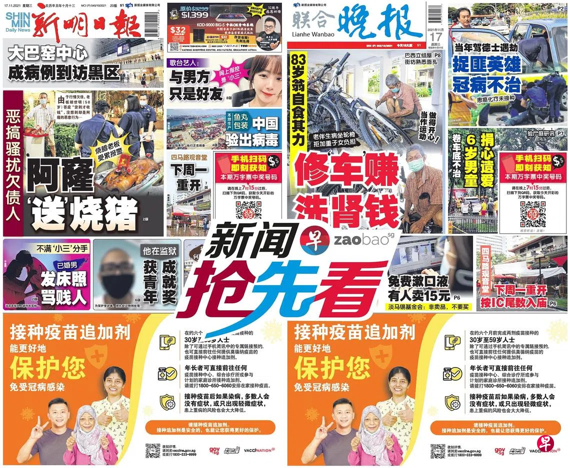 11月17日新闻抢先看:疑阿窿“送”烧猪恶搞 烧腊老板受累报警zaobao.sg直播节目《新闻抢先看》让观众第一时间掌握晚间报章《新明日报》和《联合晚报》当天的重点新闻。 《新闻抢先看》在每周一至五(公定假日除外)下午4时30分直播。节目由李丽敏、刘永健、李熙爱、卢凌之轮流主持,每期邀请新明和晚报的新闻主任和记者们上节目分享当天要闻,与观众进行交流。 ASUS是本节目的支持伙伴。 新闻抢先看新明日报联合晚报宅在家·看新闻上一篇11月17日《老总 Group Chat》:拜登习近平首次视讯峰会下一篇11月18日《老总 Group Chat》:劳工运动需顺应时代转型
