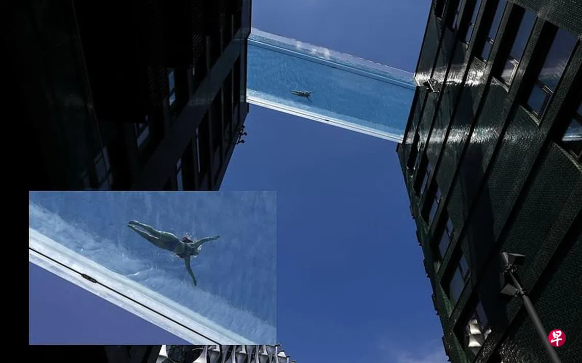 好些公寓与酒店打造出外墙透明的“无边泳池”,伦敦的一处豪宅日前则宣传它所设的“无底泳池”为全球第一座真正的“空中泳池”,这个长形泳池横跨在名为使馆花园(Embassy Gardens)项目的两幢高楼之间,从地面望上去,游泳者就像“漂浮在空中”。这个于5月19日启用的泳池建在10楼,泳者可从35公尺的高空俯瞰街景和伦敦的天际线。泳池壁材料是厚度35公分的丙烯酸纤维(acrylic)。泳池长近25公尺、深约3公尺,可承载将近400吨的水。小图为一名女子在天空中“遨游”。(新华社)