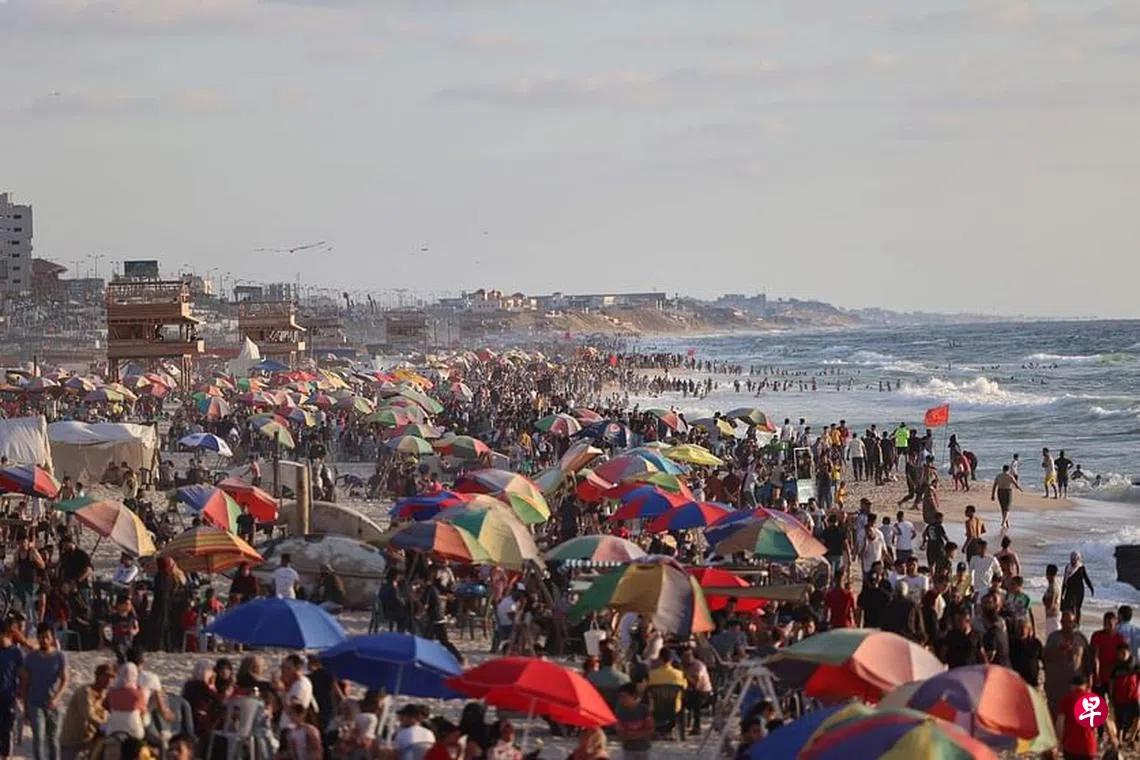在以色列占领区加沙地带的地中海海边,停火两周以来经常出现人群拥挤、令人担忧的景象。