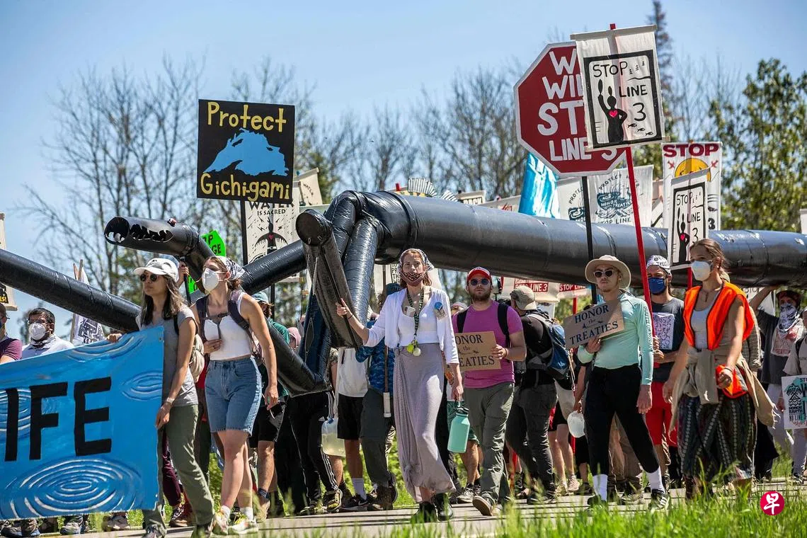 美国气候活动人士与原住民社群周一在明尼苏达州游行,抗议三号线(Line 3)输油管的改道计划。自1968年启用以来,这条管道把加拿大艾伯塔省出产的原油运送到美国中西部的炼油厂,但因年久和受到腐蚀,其输油量大不如前。运营公司恩桥(Enbridge)因此于2014年提出改建三号线输油管。由于担心新管道会破坏生态环境和原住民土地,民间组织多次举行示威抗议,但管道改建计划未受影响,预计今年底就能完工。(法新社)