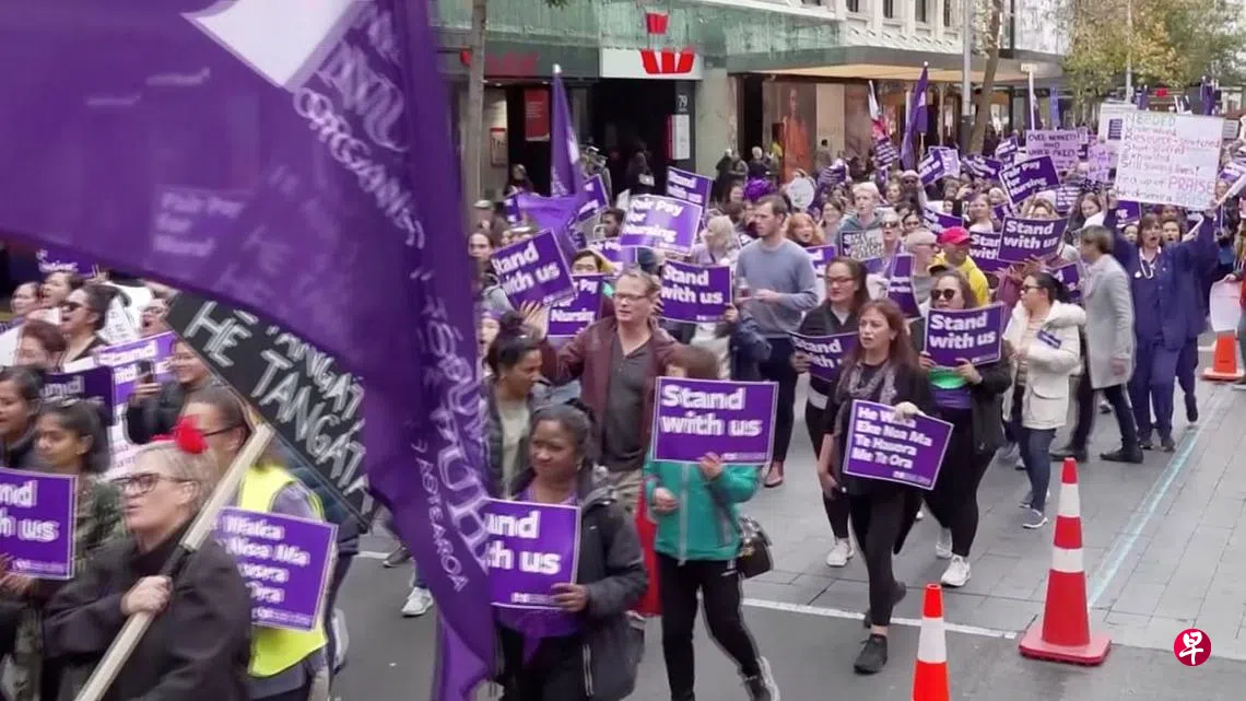 由于劳资谈判失败,数以万计任职于公立医院的新西兰护士周三在全国各地展开八小时罢工行动,以争取更合理的工资和更好的工作环境,图为最大城市奥克兰的罢工游行现场。新西兰护士组织(NZNO)此前要求给会员加薪17%,但新西兰政府财政吃紧,无法负担如此大的加薪幅度。该工会组织说,按照政府提出的条件,其多数会员只能获得约1.38%的加薪。(路透社)