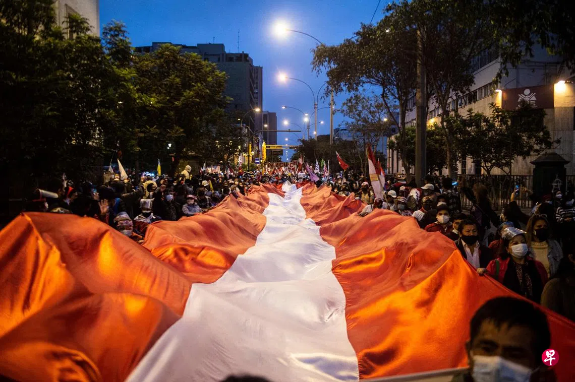 南美洲国家秘鲁总统选举争议悬而未决,图为自由秘鲁党候选人卡斯蒂略(Pedro Castillo)的支持者周六再度举行游行,声援这名左派政治人物。卡斯蒂略在6日的总统选举第二轮投票中险胜人民力量党候选人、前总统阿尔韦托·藤森之女藤森庆子,但藤森声称选举存在大规模舞弊,选举委员会因此迟迟未宣布当选者。周六也有数以千计的藤森支持者上街游行,要求废除选举结果。(法新社)