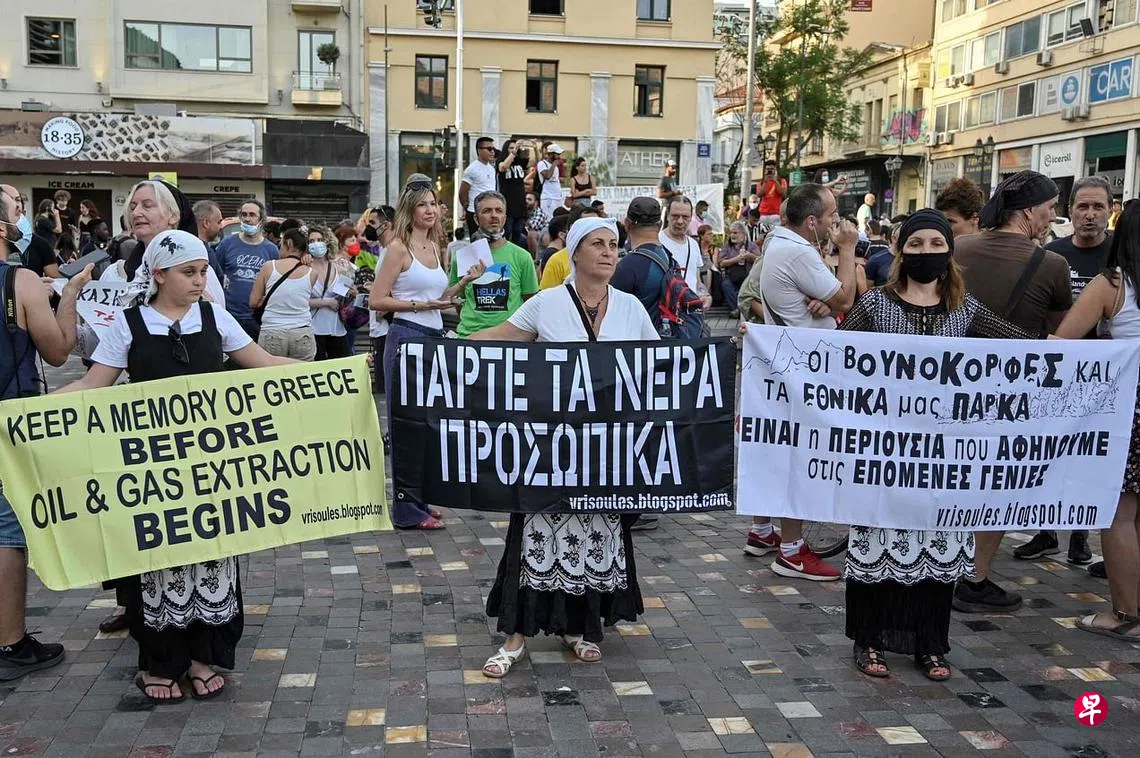 穿上希腊传统服饰的环保人士与多个环保组织周六在雅典市中心举行抗议示威,反对在希腊海域开采石油和天然气,以及正在全国多地进行的大型风力发电厂建设工程。在深陷金融危机多年后,希腊正致力于开发清洁能源,以在实现欧盟气候目标的同时改革经济。但示威者担心,油气勘探活动与风力发电厂工程将给希腊生态环境带来巨大冲击,包括破坏大片原始森林。(法新社)