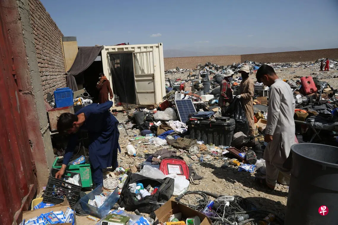 7月3日,在阿富汗帕尔万省的巴格拉姆空军基地附近,当地居民在美军遗留下的物品中回收废旧物。阿富汗国防部发言人阿曼2日说,美国和北约军队日前已全部撤离巴格拉姆空军基地,该基地已正式移交给阿富汗军队。巴格拉姆空军基地位于阿富汗帕尔万省,距喀布尔约50公里。(新华社)