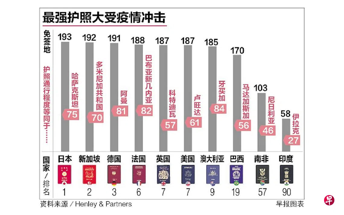 这种冠病疫情颠覆了全球护照排行榜的情况,即使对冠病疫苗接种进度领先的国家影响也很大。