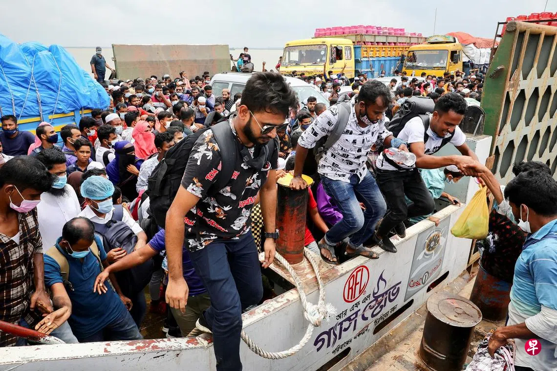 孟加拉政府批准成衣厂在内的外贸工厂前天重启运作,全国各地交通枢纽涌现大量急于回返城市打工的人潮。在孟加拉中部蒙希甘杰的马瓦渡轮港口,数以百计的员工挤上渡轮,回流城市中的工作岗位。尽管大部分地区仍“严格封锁”,但为缓解经济压力,政府决定把出口导向型工厂排除在封锁令之外。成衣行业占孟加拉外汇收入80%以上,雇用员工多达400万人。(路透社)