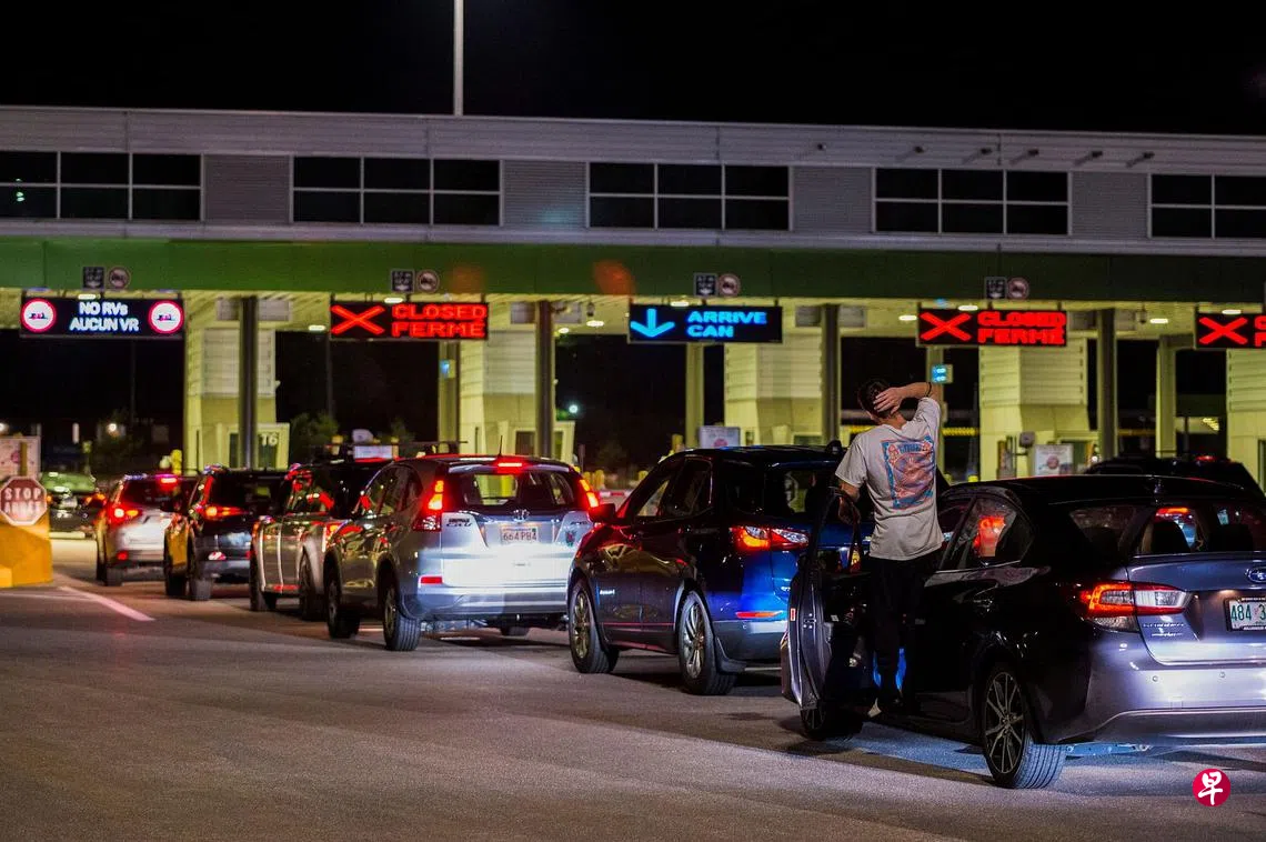 加拿大从昨天起,允许已经完成疫苗接种的美国居民入境。由于冠病疫情导致美加陆空边界前所未有地关闭了16个月,许多美国居民昨天迫不及待地开车到衔接两地的千岛大桥,准备再度入境加拿大。这使边界关卡前排起了长长的车龙,有司机因等得不耐烦而开车门查看情况。(路透社)