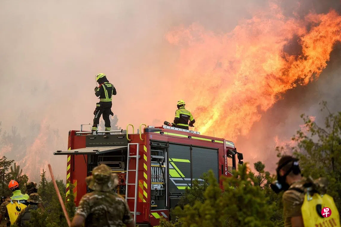 极端天气导致欧洲多国野火燎原。在东南欧巴尔干半岛的北马其顿,全国多处包括首都斯科普里都有大片森林在燃烧,政府被迫在上周四宣布进入紧急状态30天。北马其顿的欧洲邻国斯洛文尼亚和奥地利已派出消防员到当地协助灭火。图为斯洛文尼亚消防员在距离斯科普里约180公里处同林火搏斗。(法新社)